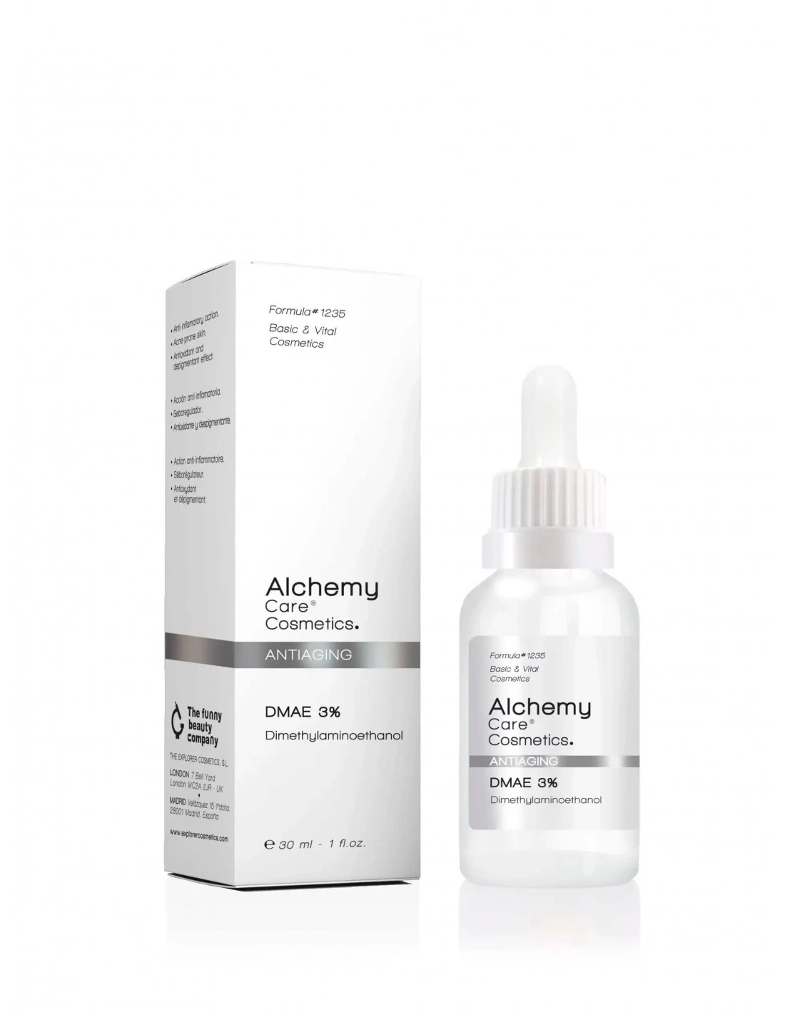 Alchemy Care Cosmetics Antiaging DMAE 3% Serum Antiedad está concentrado con Dimethylaminoethanol (DMAE al 3%) que actúa a varios niveles: aumentando la retención de agua en la dermis, estimulando la síntesis de colágeno y GAG’s dérmicos y potenciando la liberación de acetilcolina.