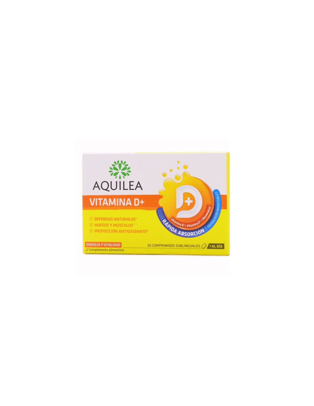 Aquilea Vitamina D+ Comprimidos Sublinguales contiene Vitamina D3 10 µg 200%, Vitamina E 12 mg 100%, Resveratrol 10mg.