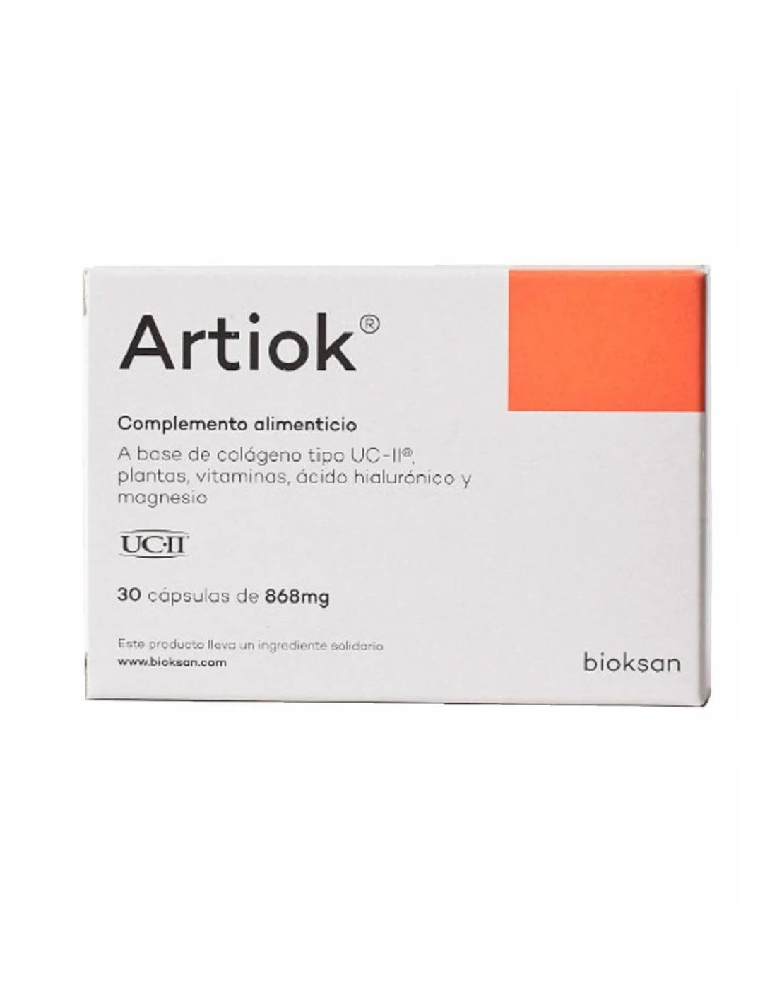 Artiok Capsulas contiene: Colágeno hidrolizado tipo UC-II 40 mg, vitamina C (ácido L-ascórbico) 40 mg (50% VRN), resina de extracto seco de boswellia serrata roxb 20 mg, raíz de cúrcuma longa 10 mg, vitamina B6 (clorhidrato de piridoxina 82%) 7,3 mg (521% VRN), vitamina B1 (clorhidrato de tiamina 79%) 6,07 mg (552% VRN), ácido hialurónico 5 mg, vitamina B2 (riboflavina) 4,2 mg (300% VRN), vitamina D (colecalciferol) 5 mcg (100% vrn), vitamina B12 (cianocobalamina) 2,5 mcg (100% VRN), maltodextrina (agente de carga), estearato de magnesio (antiaglomerante), dióxido de silicio (antiaglomerante).