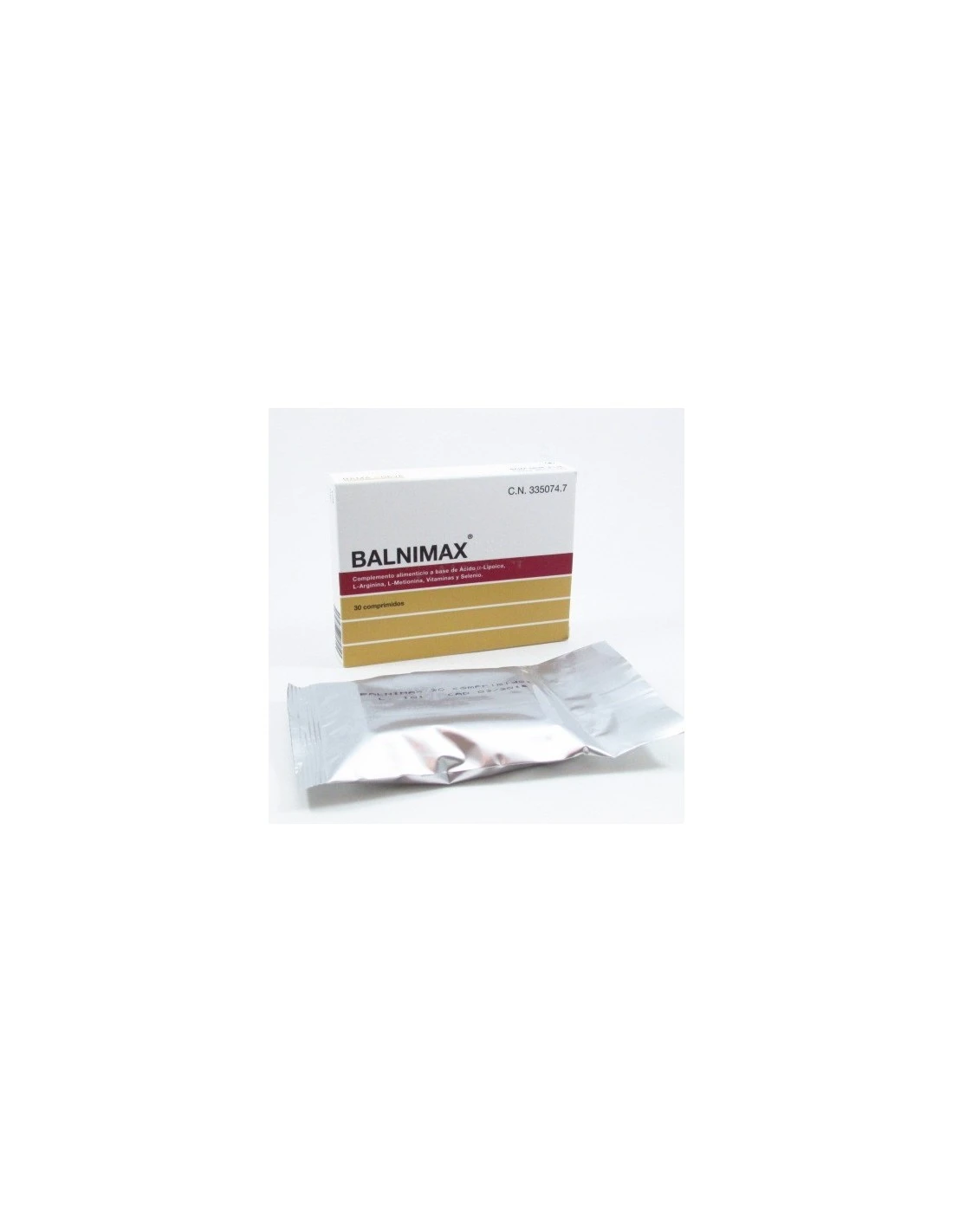 Balnimax Comprimidos contiene por comprimidos: Vitamina E (Tocoferol): 6 mgalfa-TE, Vitamina B1 (Tiamina): 0,55 mg, Vitamina B2 (Riboflavina): 0,7 mg, Vitamina B6 (Piridoxina): 0,7 mg, Vitamina B5 (á. pantoténico): 3 mg, Selenio: 27,5 mcg, L-Arginina: 150 mg, L-Metionina: 50 mg, Ácido alfa-lipoico: 300 mg