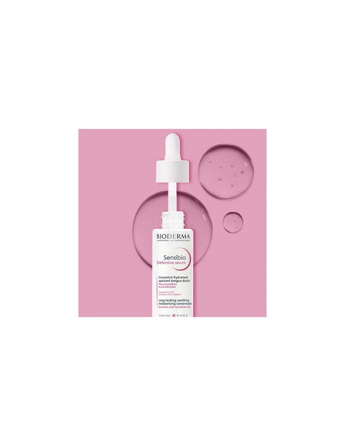 Sensibio Defensive Serum de Bioderma es un sérum facial con Ácido Hialurónico y Vitamina E para calmar, hidratar y combatir los signos del envejecimiento de la piel sensible.