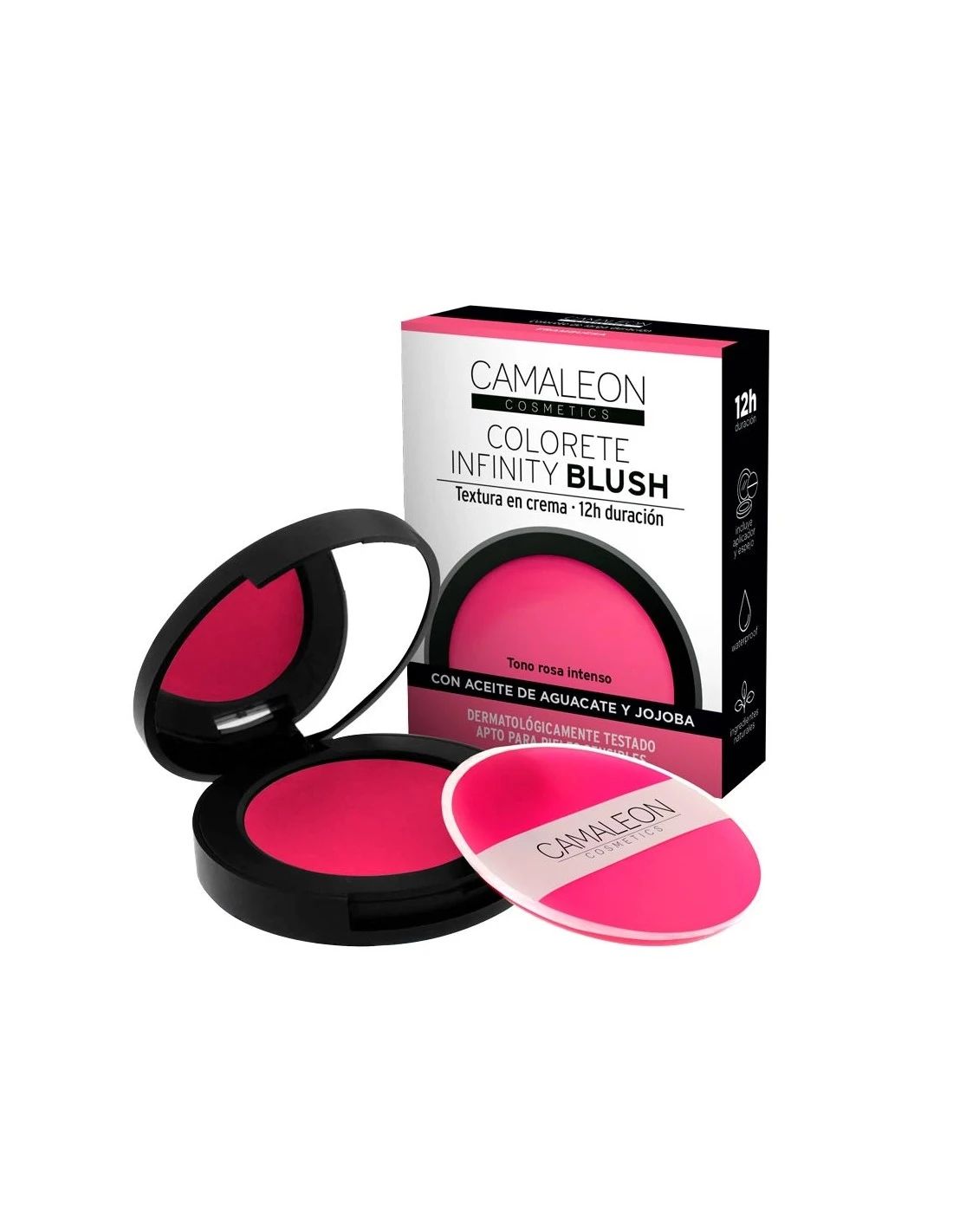 Infinity Blush de Camaleon Cosmetics es un colorete en crema tono rosa intenso que proporciona un aspecto radiante al rostro. Resistente al agua y al sudor. Con aceite de aguacate que hidrata, suaviza y protege la piel, aceite de jojoba rico en vitamina E que actúa como antioxidante y aporta hidratación y nutrición, y manteca de karité rica en vitamina A que regenera y revitaliza.