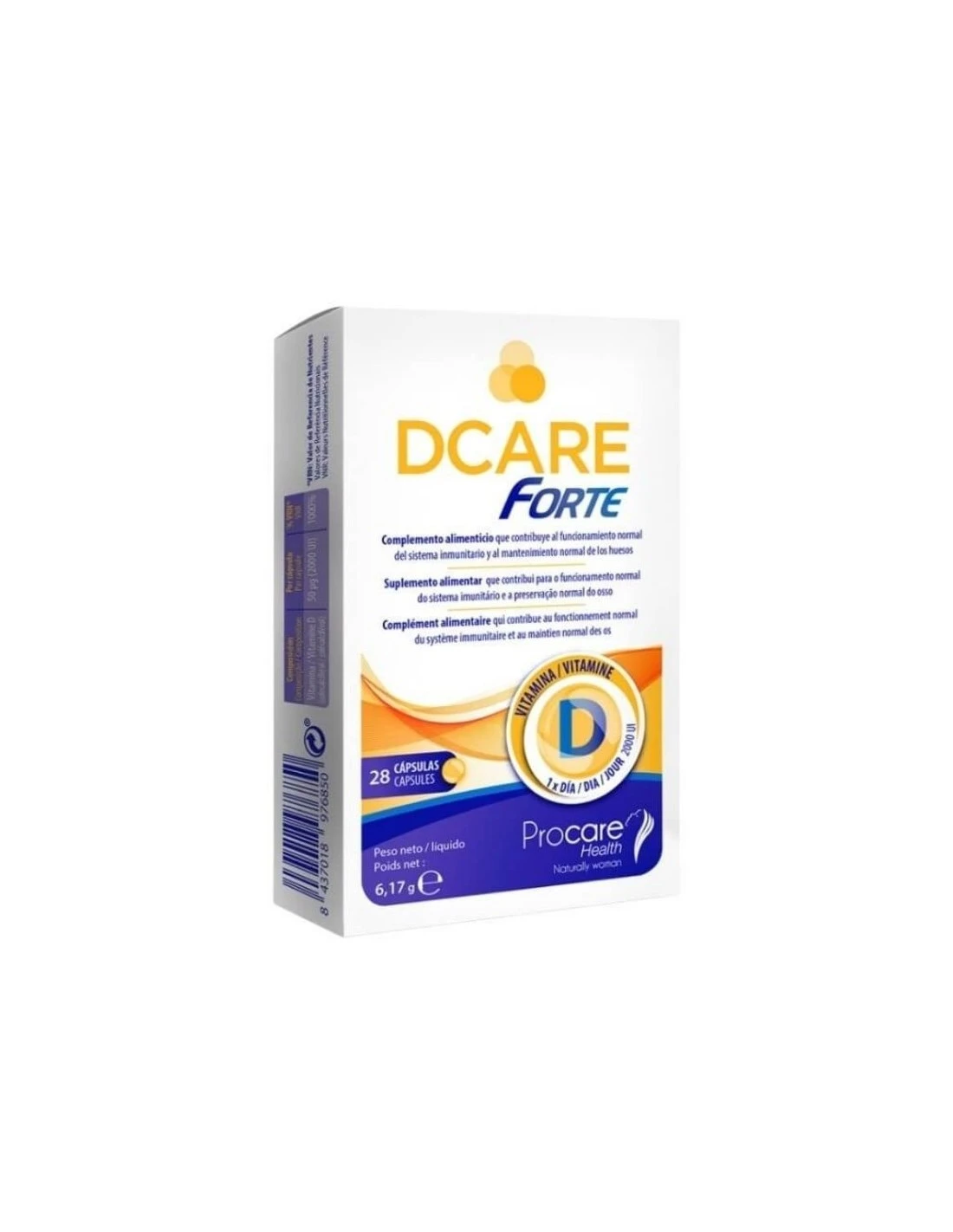 Dcare Forte de Procare Health es un complemento alimenticio de vitamina D3, que contribuye al funcionamiento normal del sistema inmunitario, función muscular y al mantenimiento normal de los huesos. Indicado para adultos con una demanda incrementada de vitamina D3. También disponible en formato de 84 cápsulas.