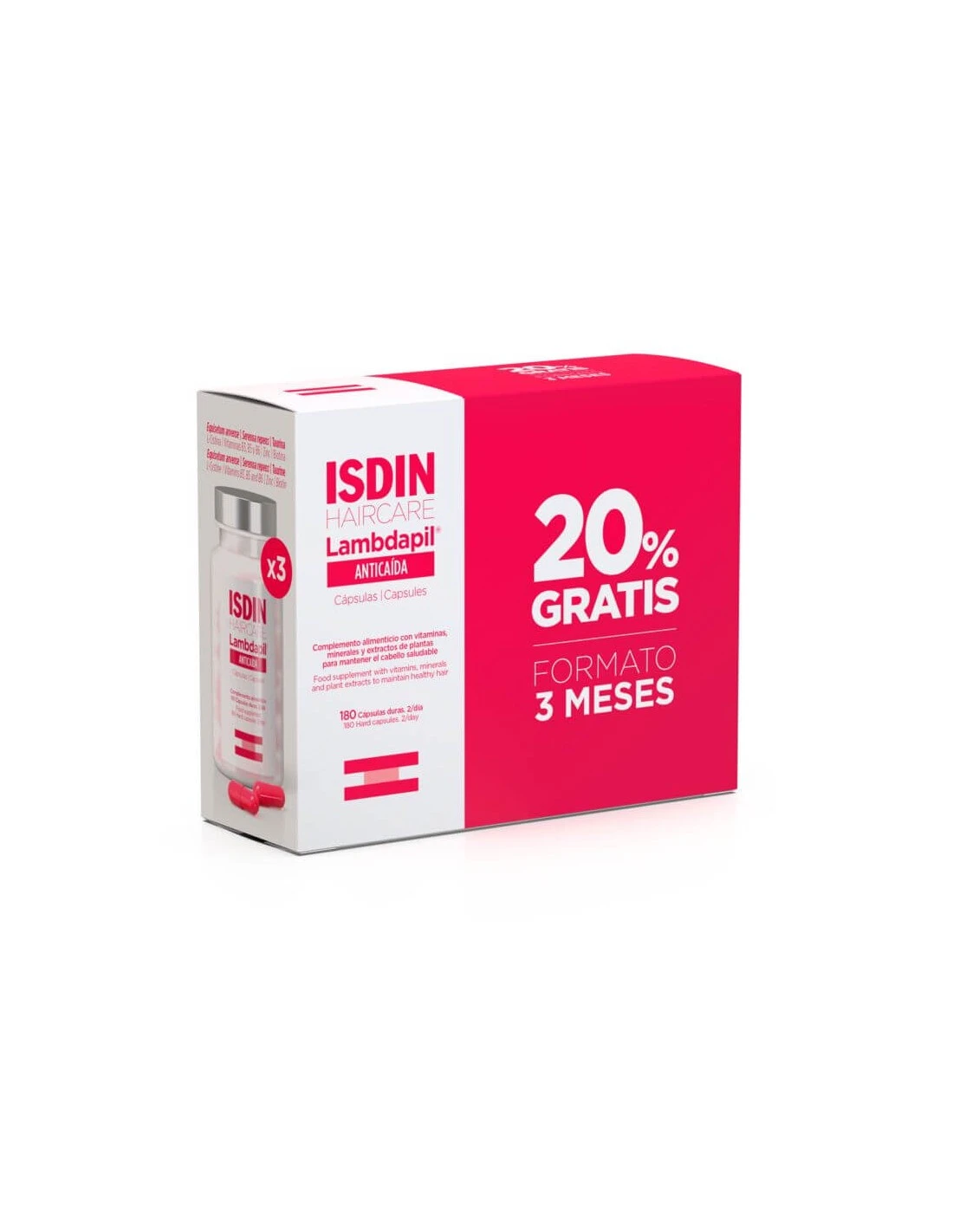Lambdapil Anticaída Cápsulas de Isdin es un complemento alimenticio que ayuda a prevenir la caída del cabello y favorece el crecimiento de nuevos cabellos. A su vez regula la secreción sebácea e incentiva el folículo piloso.