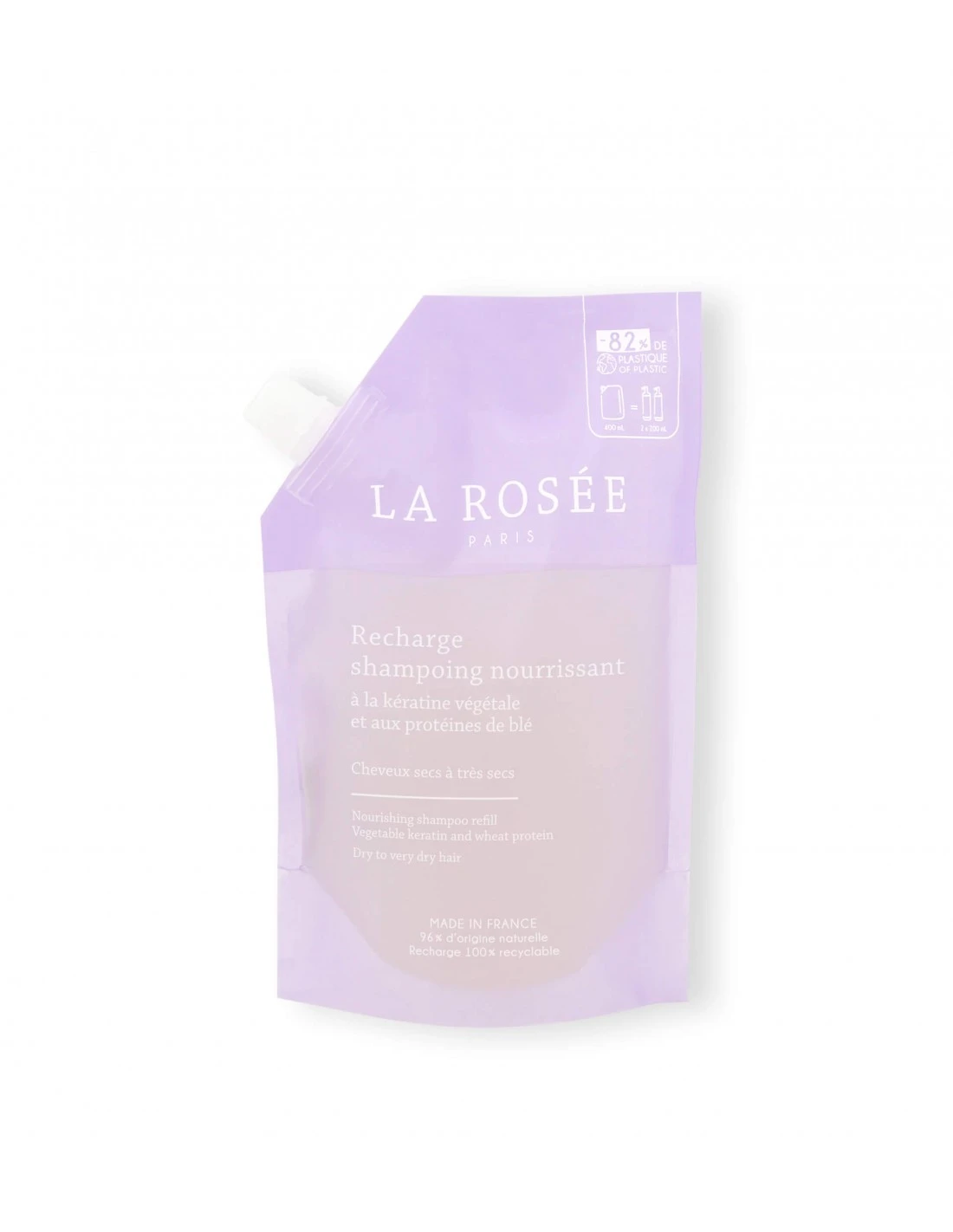 Cada recarga de 400 ml del champú nutritivo de La Rosee permite recargar hasta 2 veces tu botella de vidrio La Rosee y así ahorrar hasta un 82% de plástico.