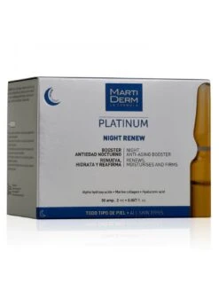 MartiDerm Platinum Night Renew contiene Alfahidroxiácidos, con acción regeneradora y renovadora gracias a su capacidad exfoliante. Con colágeno marino, permite hidratar, proteger y dar estructura a la piel.