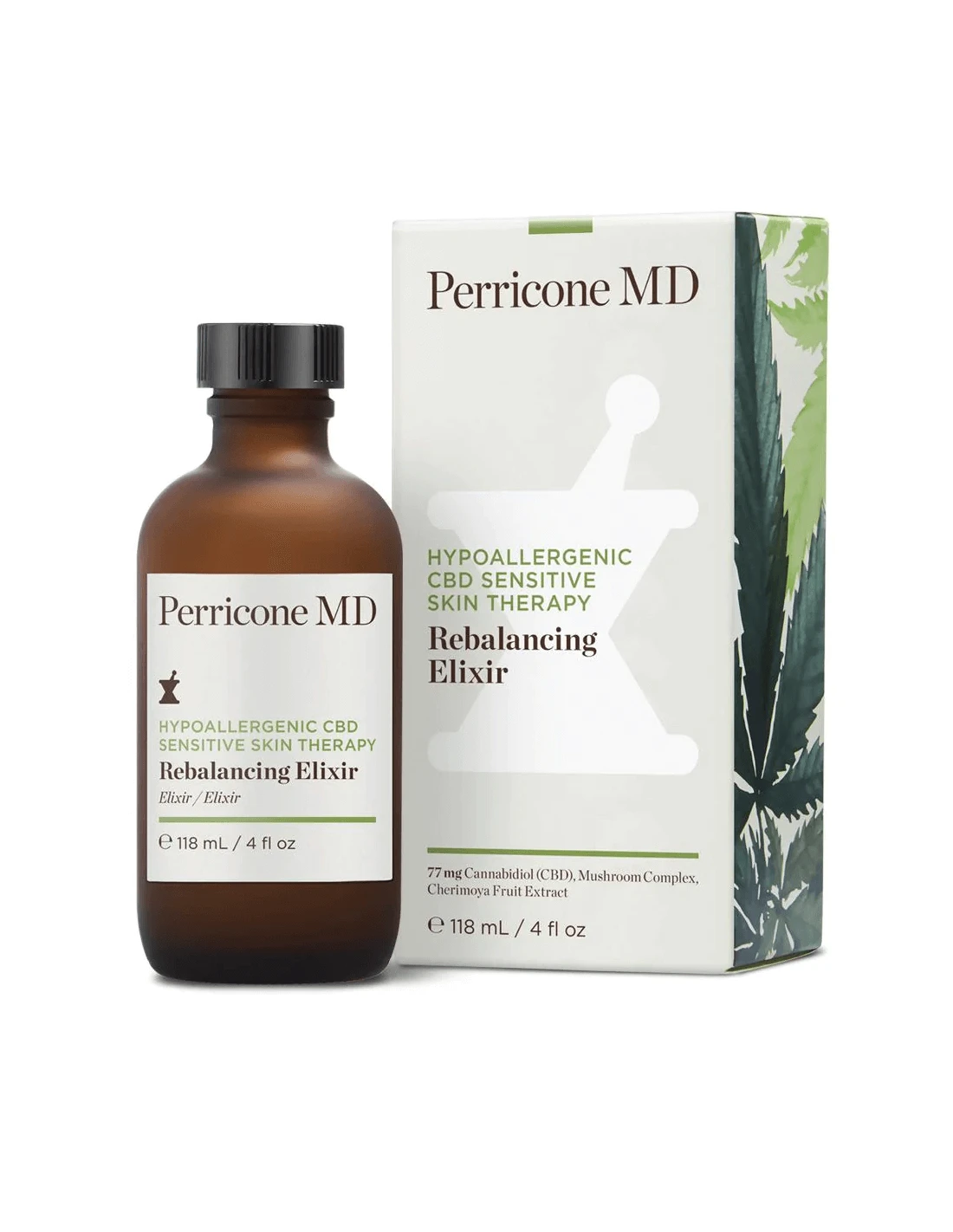 Hypoallergenic CBC Rebalancing Elixir de Perricone MD formulado con cannabidiol (CBD) puro al 99%, es un elixir suave y calmante diseñado para hidratar visiblemente, suavizar la textura y unificar el tono de la piel para lucirla flexible y radiante.