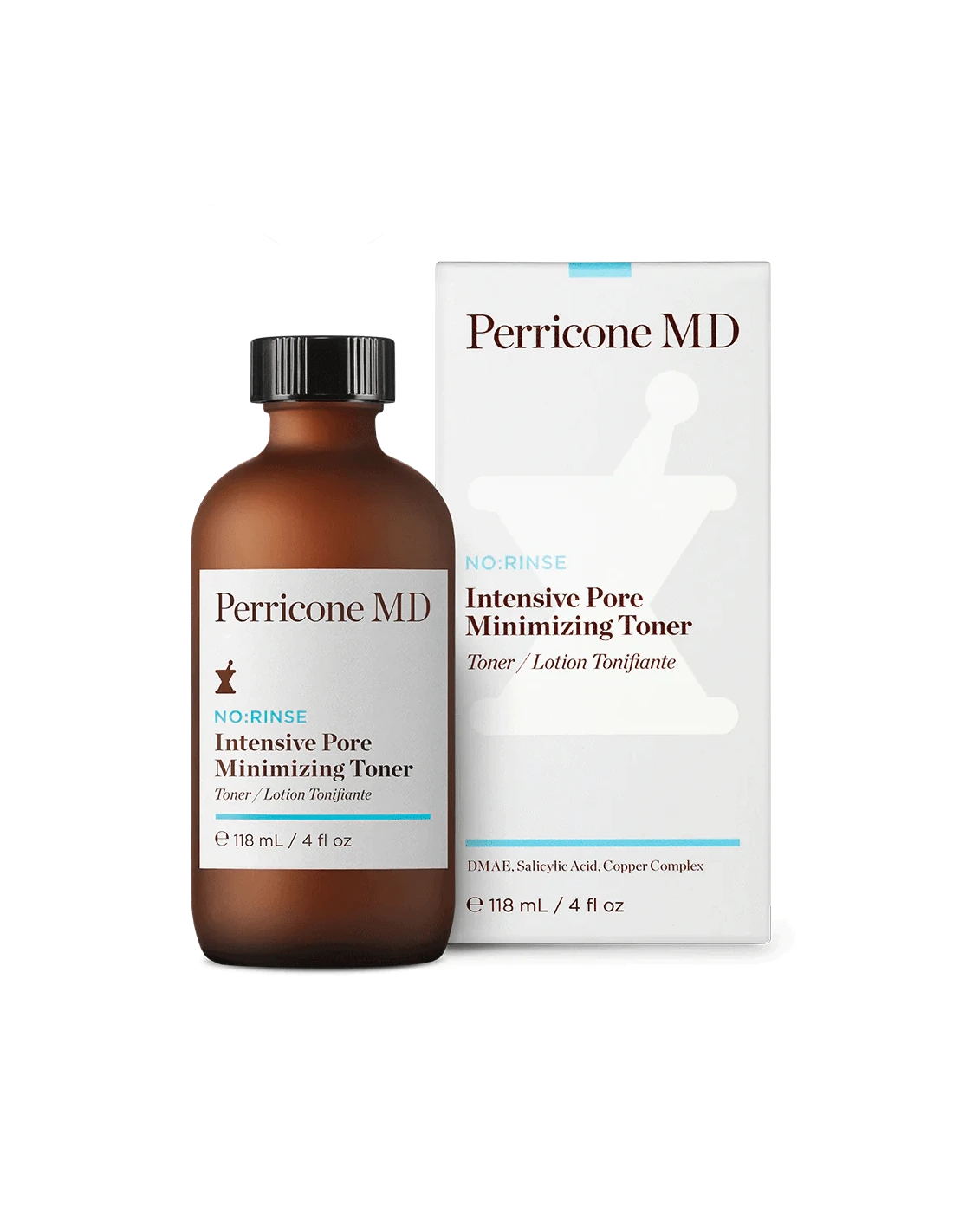 No:Rinse Intensive Pore Minimizing Toner de Perricone MD está formulado con DMAE, ácido salicílico y un complejo de cobre para visiblemente reafirmar, hidratar y energizar la piel.
