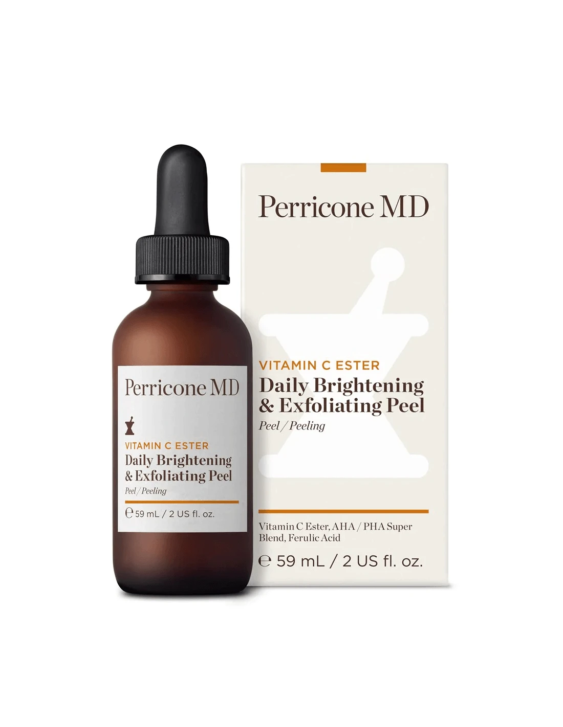 Vitamin C Ester Daily Brightening & Exfoliating Peel de Perricone MD es un avanzado peeling rejuvenecedor sin aclarado que ayuda a eliminar las células muertas de la piel y a suavizar la textura irregular, al tiempo que mejora al instante la luminosidad y el brillo de la piel.