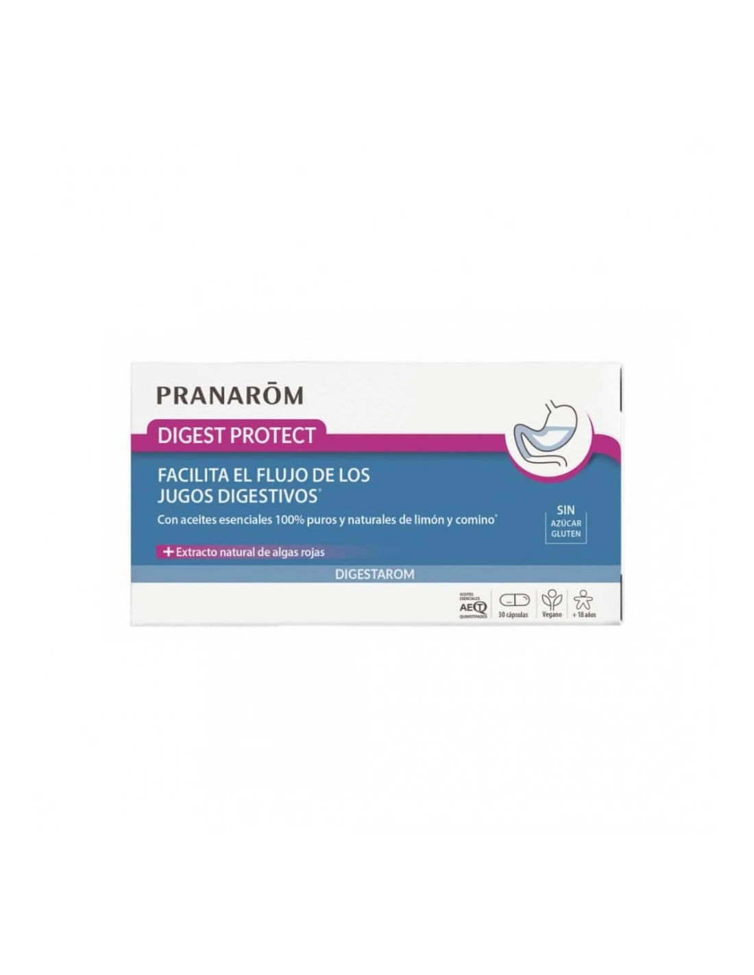 Una o dos veces al día, ingerir 2 cápsulas de Pranarom Digest Protect con un vaso de agua después de las comidas. Solo para mayores de 18 años.