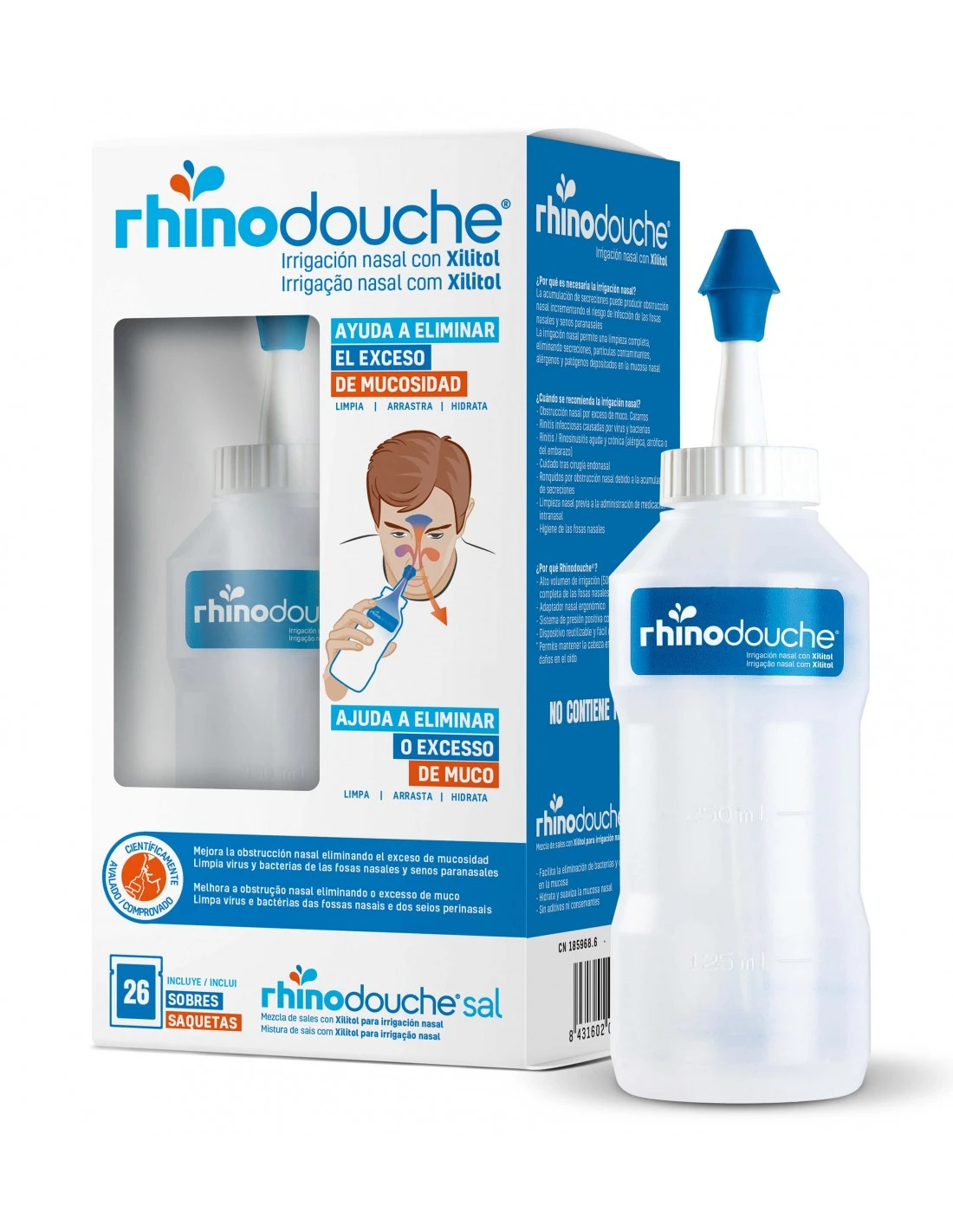 La irrigación nasal con Rhinodouche está indicada para: Obstrucción nasal por exceso de moco. Catarros. Rinitis infecciosas causadas por virus y bacterias. Rinitis / Rinosinusitis aguda y crónica (alérgica, atrófica o del embarazo). Cuidado tras cirugía endonasal. Ronquidos por obstrucción nasal debido a la acumulación de secreciones. Limpieza nasal previa a la administración de medicación intranasal. Higiene de las fosas nasales.