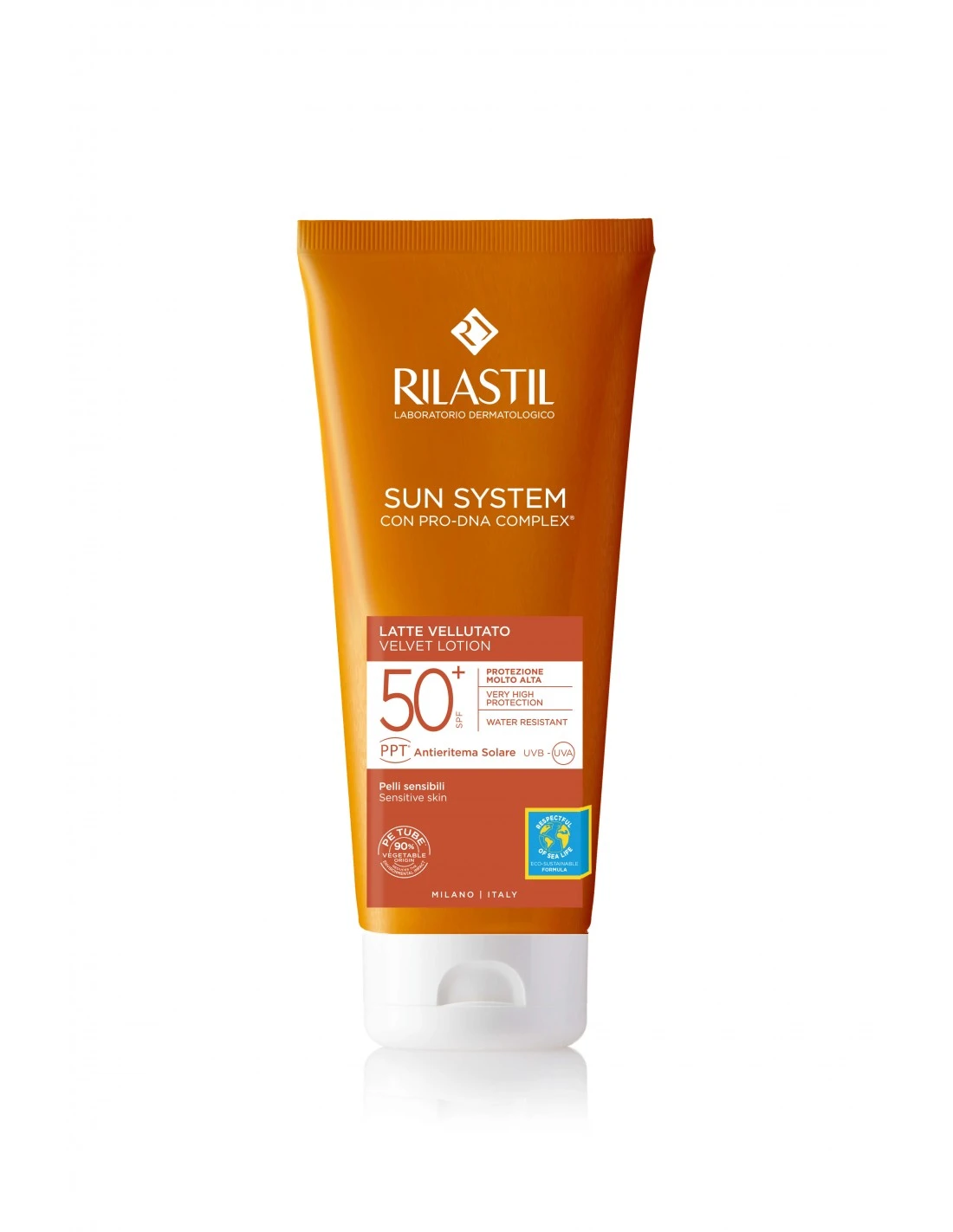 Rilastil Sun System Locion Velvet SPF50+ otorga una alta protección de amplio espectro de las radiaciones UVA y UVB, además de acción antioxidante.