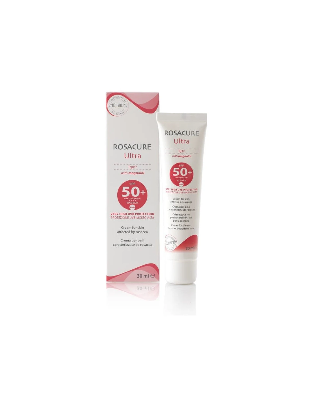 Rosacure Ultra SPF 50+ está formulado con magnolol, metilsulfonilmetano y ácido poliglutámico, que permite atenuar las sensaciones desagradables de picor y prurito. Además contiene filtros solares, que protegen la piel frente a los rayos UVA y UVB.