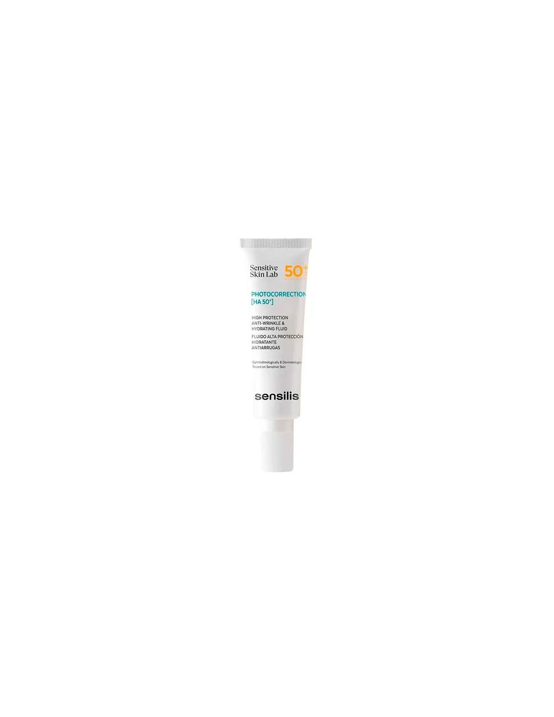 Photocorrection HA 50+ de Sensilis protege frente a los rayos UVA, UVB y luz azul gracias a su factor de protección solar SPF 50+. Previene el fotoenvejecimiento, las manchas solares y las quemaduras.
