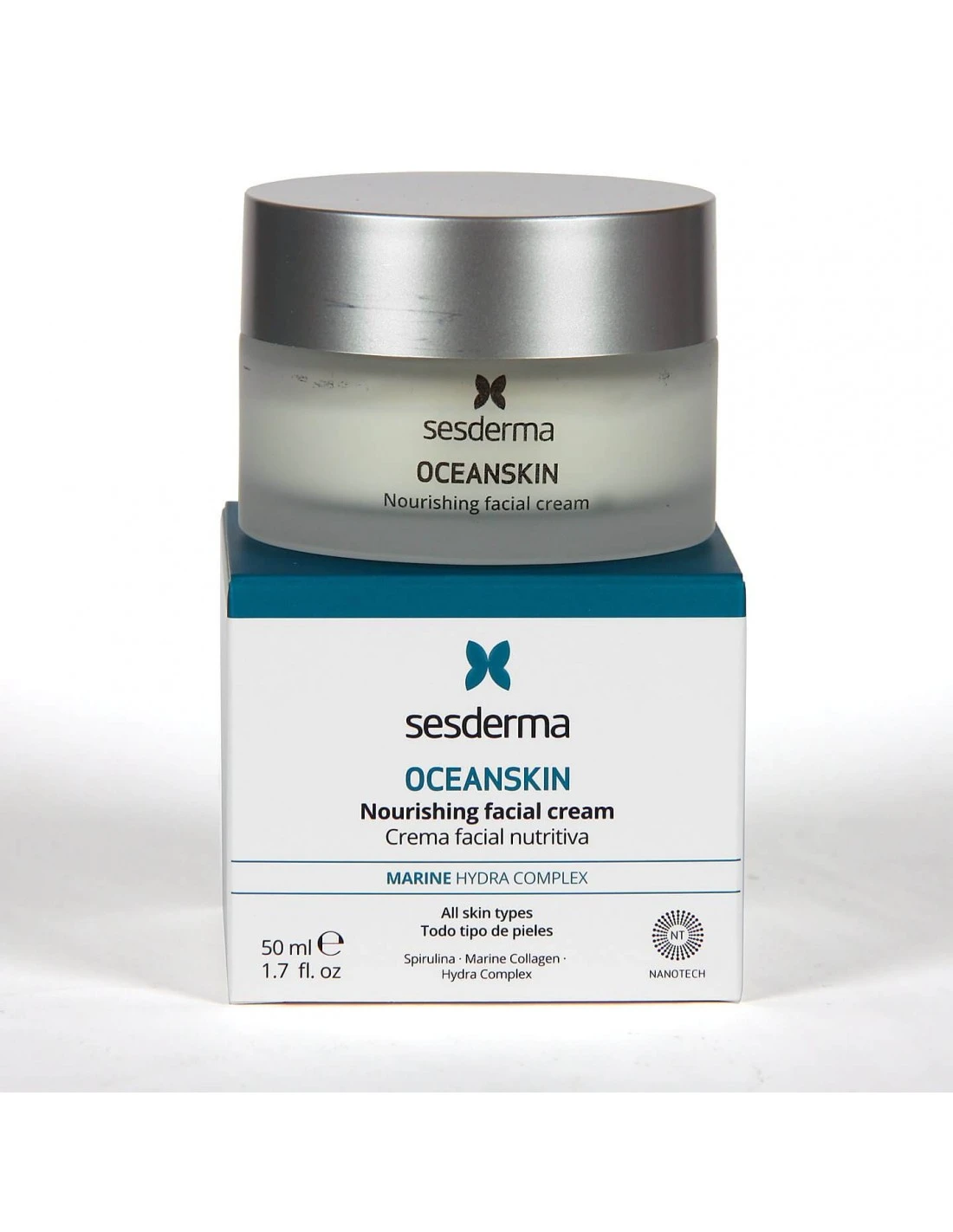 Oceanskin Crema Facial Nutritiva Sesderma se conmine de Espirulina, colágeno marino, algas marinas y extracto de caviar, así como el exclusivo Ses Hidra Complex, compuesto por aceites naturales.