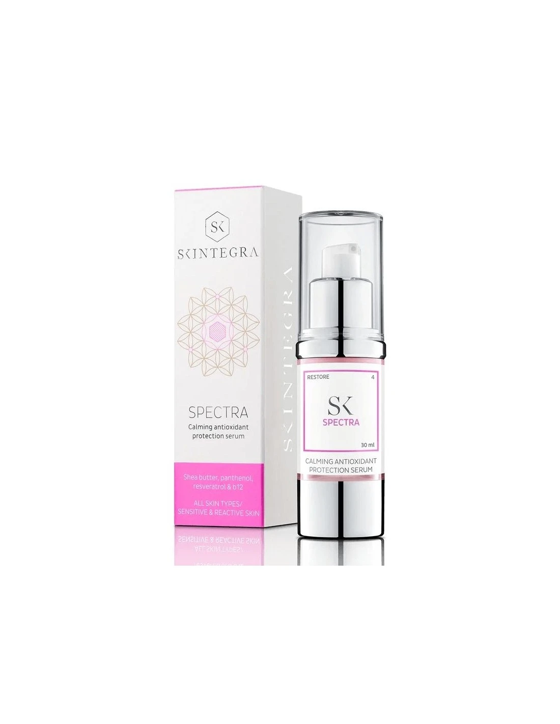 El serum Spectra de Skintegra, une las propiedades calmantes y protectoras de la Manteca de Karité, Pantenol, Alantoína y la Vitamina B12, junto con los efectos antioxidantes del extracto de Té Verde, Cafeína y uno de los compuestos más potentes de los polifenoles: el Resveratrol.