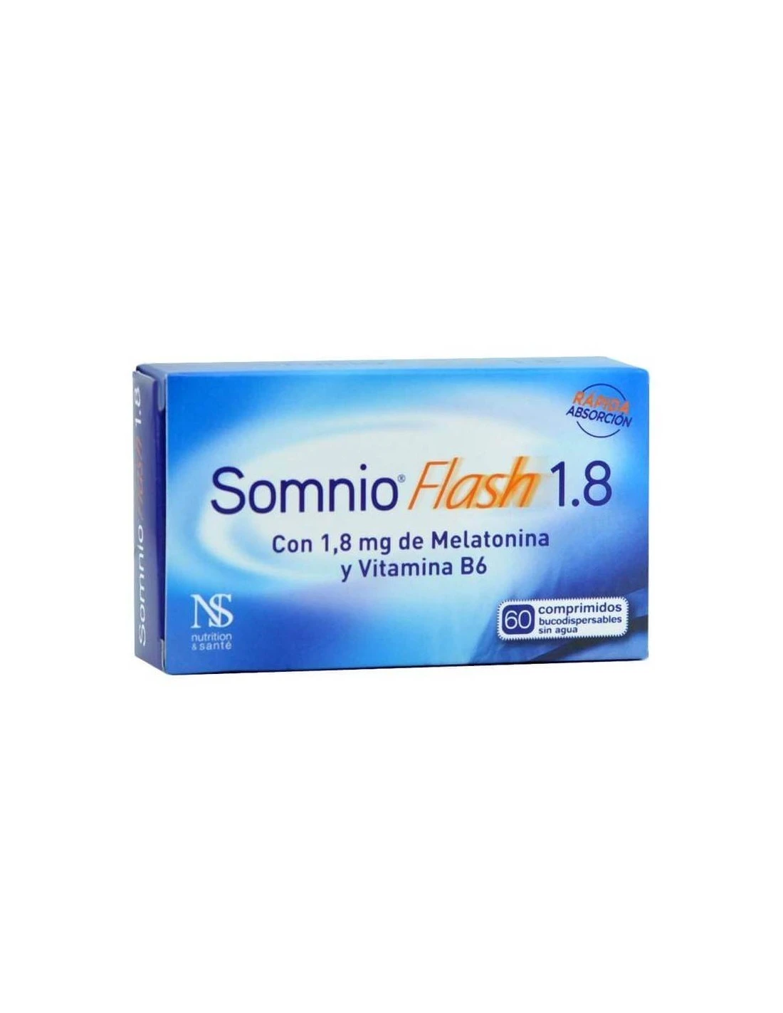 Dos comprimidos de Somnio Flash 1,8 contienen: • Melatonina, 1,8 mg (0,9 mg por comprimido). • Vitamina B6, 1,4 mg (100% VRN). Los demás ingredientes que completan el comprimido son: Jarabe de glucosa, agente de carga: celulosa microcristalina, estabilizante: goma de celulosa entrelazada, aroma, antiaglomerante: sales de magnesio de ácidos grasos, edulcorante: sucralosa.