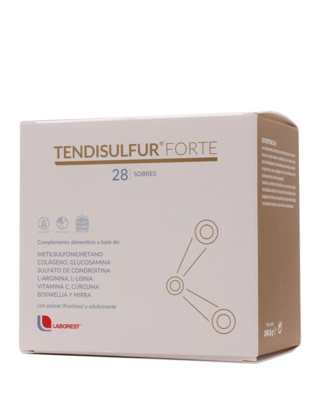 Tendisulfur Forte Sobres contine por sobre: Metilsulfonilmetano (MSM) 2500 mg, fructosa, colágeno hidrolizado 1000 mg, L-arginina, L-lisina clorhidrato, vitamina C (ácido L-ascórbico), acidulante: ácido cítrico; glucosamina clorhidrato, condroitín sulfato, aroma, extracto de Boswellia carteris Birdw, goma-resina, proteína de arroz) 100 mg, extracto de Cúrcuma (Curcuma longa L., rizoma) 100 mg, antiaglomerante: dióxido de silicio; extracto de mirra (extracto de Commiphora myrrha (Ness) Engl., olo-goma-resina, proteína de arroz) 50 mg, edulcorante: sucralosa.