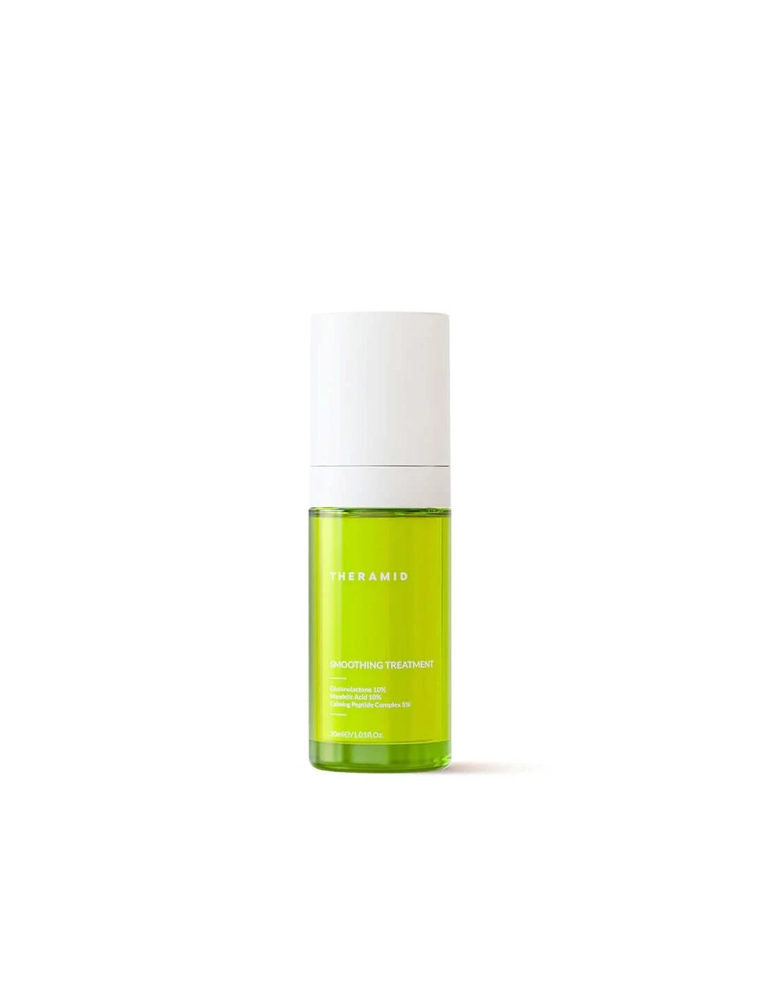 Smoothing Treatment de Theramid tratamiento iluminador antiedad de última generación repleto de una potente mezcla de ácidos al 20% (10% de AHA y 10% de PHA), combinada con un complejo de péptidos calmantes que estimulan la renovación de la piel a la vez que previenen la irritación.