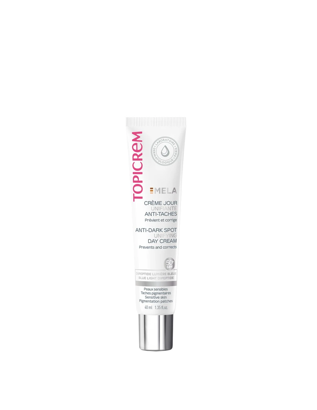 Crema Correctora de Dia Antimanchas Mela de Topicrem, crema de día unificadora para pieles sensibles que combina una eficaz prevención y corrección de manchas oscuras con una muy alta protección SPF50+ UV y de luz azul.