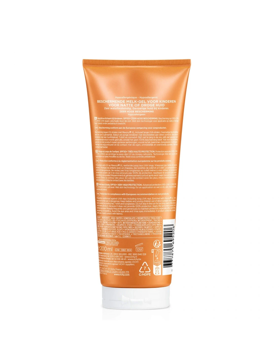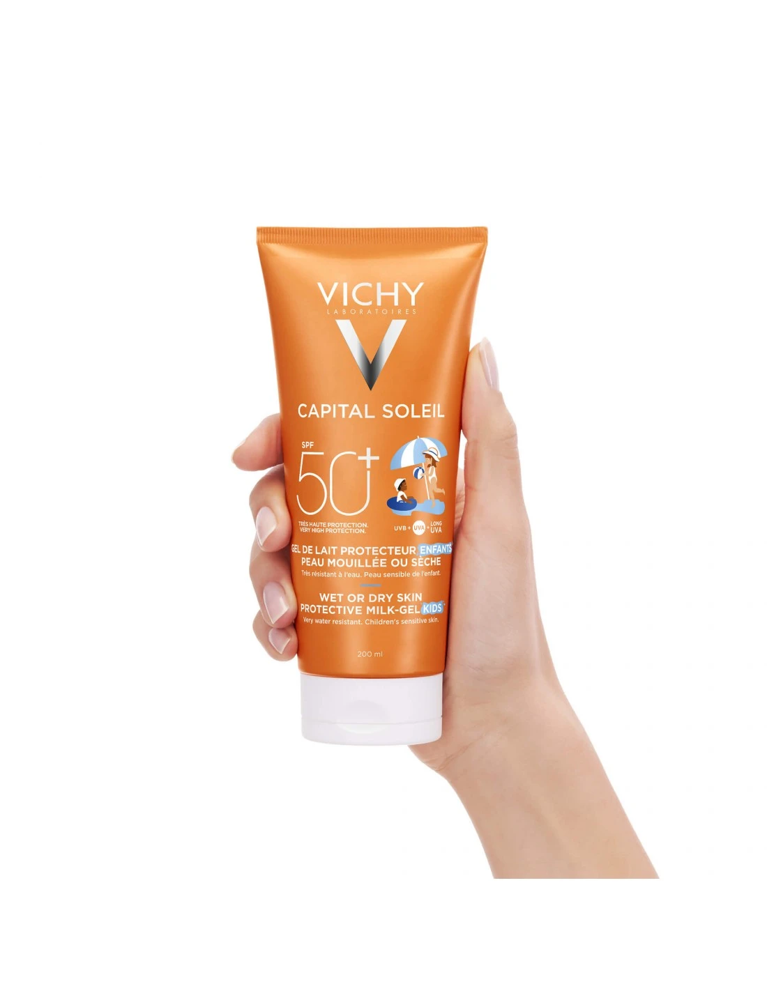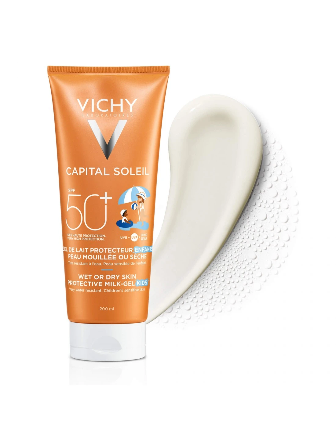 Gel Wet Skin Niños de Vichy es la crema solar para el cuidado y protección de la piel de los más pequeños. Contiene una fórmula resistente al agua con protección UV y alta eficacia. SPF50+.