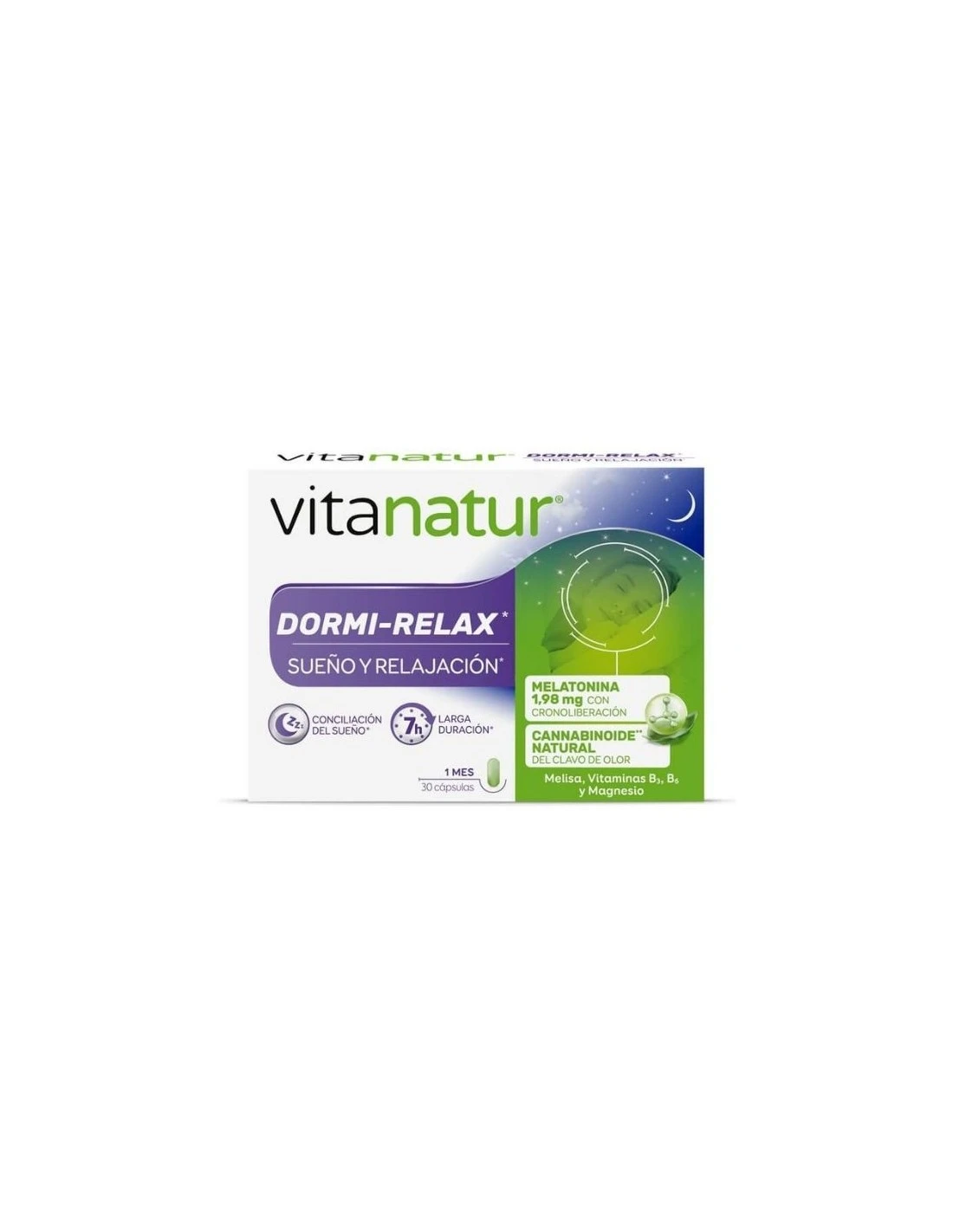Vitanatur Dormi Relax está formulado con melatonina de liberación lenta, clavo de olor, melisa, vitamina B3, B6 y magnesio.