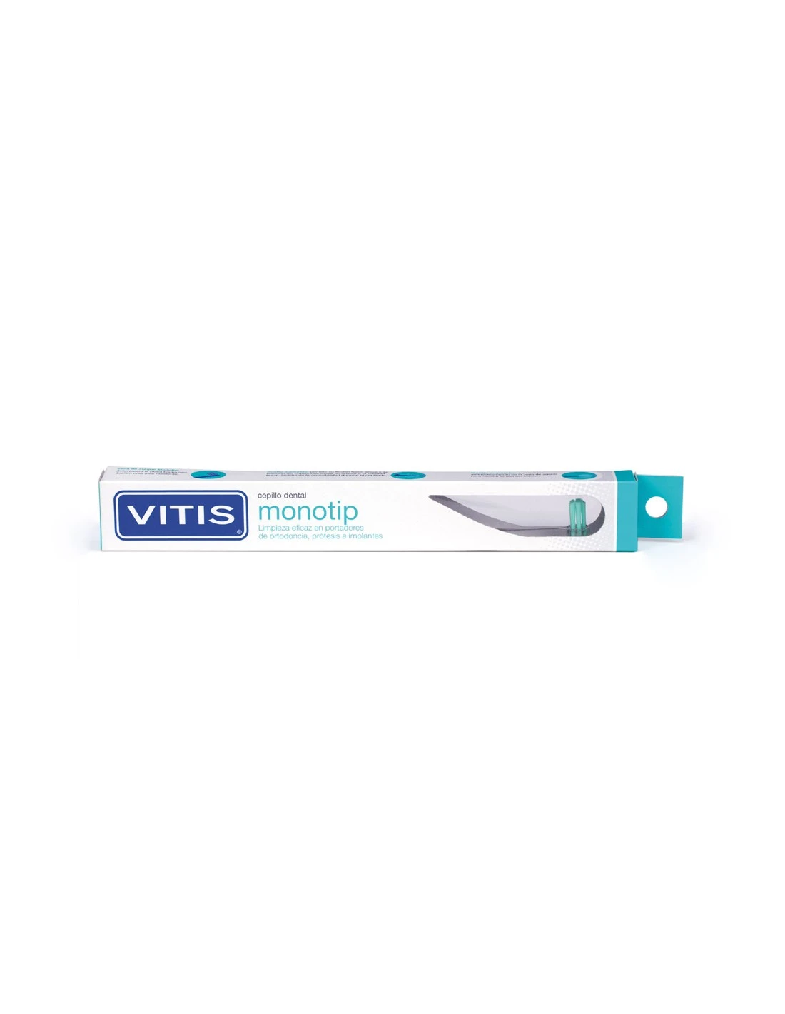 Cepillo Monotip de Vitis es un cepillo especial con cabezal redondo, que facilita la limpieza de los dientes apiñados, puentes fijos y aparatos de ortodoncia. También está indicado para pacientes con implantes, prótesis fijas o removibles.