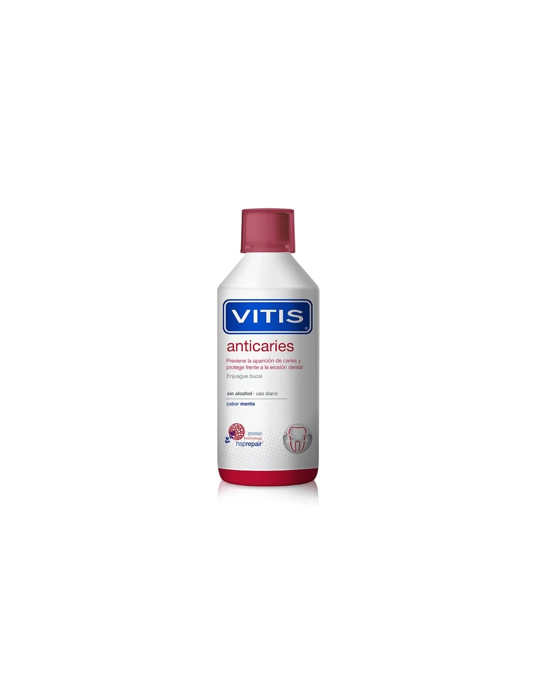 Anticaries Colutorio de Vitis ayuda a prevenir a tres niveles la aparición de la caries. En combinación con la pasta dentífrica repara, refuerza, y remineraliza el esmalte para una prevención superior de la caries dental, y además protege frente a la erosión dental.